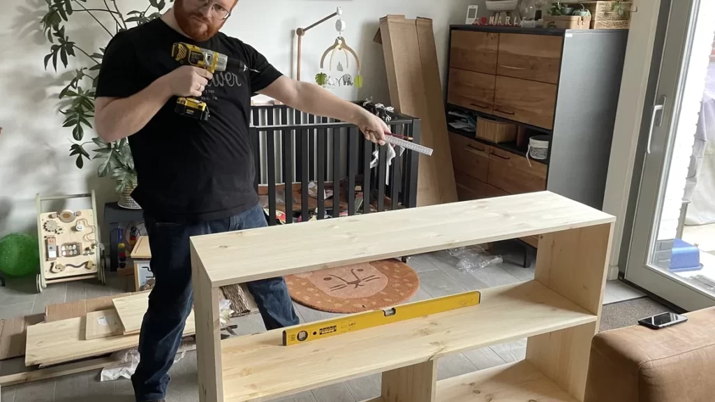 Marquez les points de percage sur les planches pour les étagères. Assemblez avec des vis et des supports d’angle pour plus de stabilité.